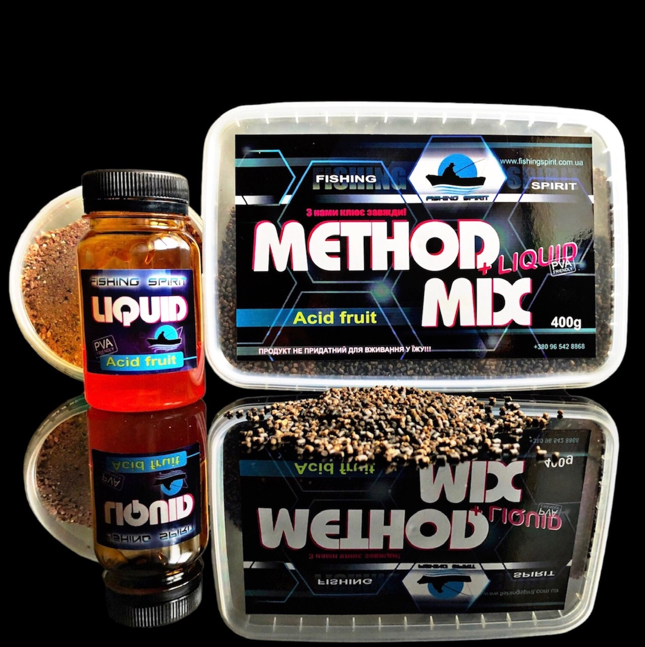 Поєднання пелетсів, яке є основновною складовою міксу, підібрано для успішного використання в холодній та теплій воді. Даний мікс містить у своєму складі великий відсоток білків та жирів, водночас чудово вбирає рідини та різного роду аромати. Саме тому, до складу метод міксу входить ємність з концентрованим, високоатрактивним ліквідом (смаком), використовуючи який, Ви робите мікс привабливим для риби. Також метод мікс включає у свій склад багатокомпонентний активатор, в основу якого входять продукти тваринного та рослинного походження. При використанні активатора створюється додатковий візуальний та харчовий сигнали в точці лову, що забезпечує більшу кількість клювань.